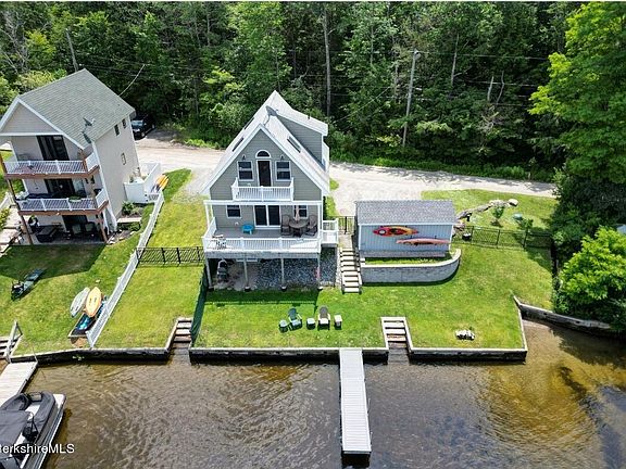 Don't miss the opportunity to make this pristine, lakefront property complete with multi-level decks, dock, 90 feet of water frontage and views galore your own. From the second you enter the front door, lake views beckon you. An open floor plan features a modern kitchen with granite countertops and stainless steel appliances. The spacious living room leads to a deck overlooking the lake. Also on the first floor are a full bath and bedroom. On the second floor, there are two additional bedrooms offering built in storage, vaulted ceilings and skylights. Glass doors in the primary lead to a private, deck with panoramic views of the lake. An expansive family room on the ground floor offer radiant floor heating, laundry and a half bath. The patio doors lead you to the back yard with a private green space, dock and two sets of stairs leading right into the lake for swimming and outdoor fun. From sunrise to sunset, this property is the perfect place for family gatherings, relaxation and easy living in the Berkshires.