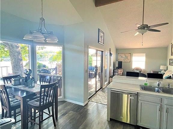 This gem of a cabin in a wide cove with a gorgeous shaded view is all you need to enjoy the Lake of the Ozarks and every single thing is well-maintained and completely charming. The property is located on a gentle lot with a wealth of shade trees and plenty of parking. The home lives larger with a wall of windows on the lakefront and an open floorplan with vaulted ceilings in the living, kitchen and dining. The layout also offers an ample master bedroom that has its own private bath and a second bathroom for the spacious guest bedroom. A generous deck off the living room provides for more lake relaxation with an expansion of living and dining space. The parcel is completely rocked with well planned drainage, so you can spend your time enjoying the lake instead of slaving away with yard maintenance. The choice is yours to kick back in your oasis or venture out from this very popular cove which is only minutes from some of the hottest restaurants and bars at the lake.