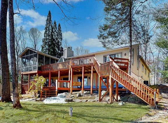 CUSTOM-BUILT CEDAR SIDED, LAKEFRONT CONTEMPORARY ON 1.27 ACRES-MILFORD! Enjoy your own Pocono Oasis featuring 4 Br's, plus 2 more sleeping quarters in the basement level, 3.5 baths, 1st Floor Master Bedroom Suite and Private Ensuite Bath w walk-in shower. Special features include hardwood, tile, and carpeted floorings, 4 fireplaces, upgraded kitchen with custom wood cabinets and granite countertops, Anderson windows, 8' sliding glass doors, full finished walkout basement with glass doors to large deck, and in-ground swimming pool with water slide! This one-of-a-kind house surrounds a center atrium specially equipped with a 6-man hot tub! and MULTILEVEL BACK DECKS THAT LEAD TO YOUR OWN PRIVATE DOCK AND OFFER INCREDIBLE VIEWS OF A BEAUTIFUL SPRING-FED LAKE