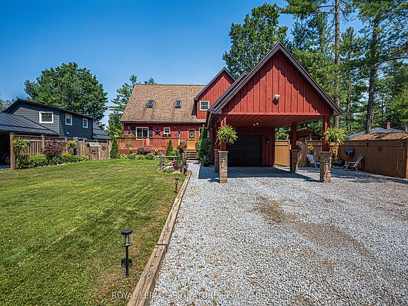 Postcard Perfect Waterfront Living! This beautifully maintained 3+1 bedroom, 3 bath year-round home offers big boat access to the Trent Severn Waterway and features cathedral ceilings, hardwood floors, and a floor-to-ceiling stone fireplace in an open-concept layout with multiple walkouts to a large deck showcasing stunning water views. The finished lower level includes a spacious rec room, games area, built-in sauna in the washroom basement and elevated wet bar-ideal for entertaining. The primary suite boasts a walkout balcony, 5-piece ensuite, walk-through closet, and private studio/office space. Enjoy deep water access, covered wet slip, plus attached and detached garages for all your waterfront lifestyle needs.
