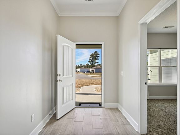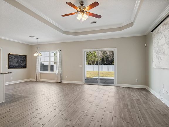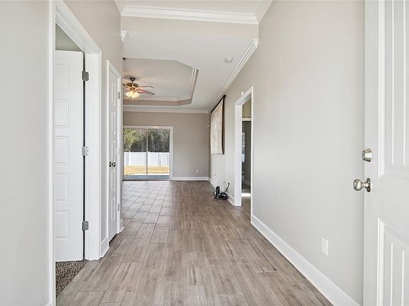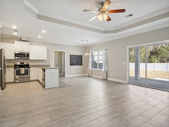 Looking for a newer home at a good price? This is the real deal and move in ready. Modern, nearly NEW home on .6 acres (TBV)! NO HOA. So much to appreciate in a quality home built in 2018. Open kitchen and living area, high ceilings, crown molding, trey ceilings, wood look tile flooring, granite, stainless, pretty cabinets, inside laundry, 2 car garage, covered patio, low maintenance cement plank siding, vinyl privacy fence and it all backs up to a wooded area. Split floor plan with 4 bed, 2 baths. Plenty of curb appeal with light green painted cement plank siding, stone mulch, raised planters and a drain system. Behind the fence is mulch system and raised garden planters. Primary bedroom features a trey ceiling and private bath. Bath has tile shower, soaker tub, double vanity, and a walk-in-closet. Located in the back of the Meadows subdivision with a large yard. Close to I- 95 shopping and Naval Base! Easy to show! Schedule your appointment today!