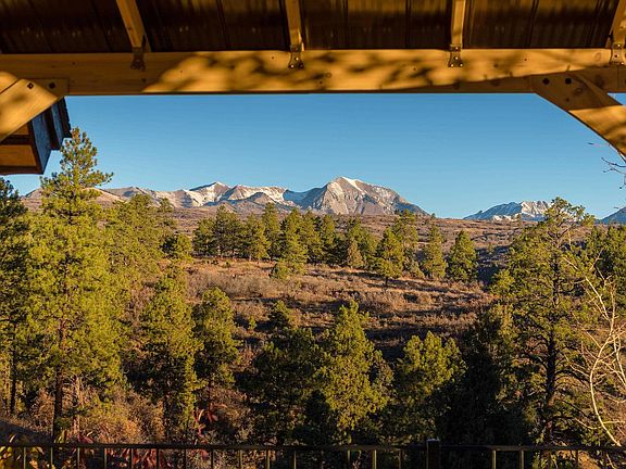 Magnificent 35-acre property with a gorgeous custom 3518 sq.ft. home with log detail and stucco that was built in 2007 with geothermal heating and cooling, and wall of windows. The residence features 3 en-suite bedrooms, 3.5 bathrooms, 2 bonus rooms, a partially heated in-floor 3-car attached garage with upper loft storage and gorgeous views of the La Plata Mountains, Twin Buttes and Missionary Ridge. Close to town, yet very private with close access to over 3000 acres of State of Colorado land for riding and hiking through the subdivision. The architectural details and lovely finishes make this a perfect Colorado retreat that embodies rural elegance at its best. The paved driveway welcomes you through pine trees to a private area for guest parking. Some of the amenities of residence include geothermal in-floor heating and cooling on all 3 levels, Pella double pane windows, central vacuum system, new GE Cafe appliances, Reverse Osmosis system at kitchen sink and refrigerator, entire home sound system, concrete floors between the levels for better insulation, radon mitigation in place, Knotty Alder interior doors and trim, Knotty Alder cabinets, dog shower in the garage, 2 wood burning fireplaces, excellent 15GPM water well drilled by DAK Drilling in 2015, underground 1800-gallon cistern fed by the private well, engineered septic system, and much more. All logs and trim on the exterior of the home have been recently re-stained for protection from the elements. There is also new paint in several interior rooms and outside stucco walls. From the moment, you step through the front door, towering peaked windows looking east offer a stunning view of Twin Buttes and Missionary Ridge, you literally see for miles! The high ceilings with log accents and the floor-to-ceiling river rock surround, wood burning fireplace with built-in cabinets and display shelves invite you to sit and enjoy the ambiance of the space. The entry hallway offers a large coat closet and a powder room with a hammered copper sink and matching mirror. The sliding doors next to the dining area lead to the newly extended deck with new metal railings, and new spiral staircase to the lower level. Plus, a portion of the deck has been recently covered offering an outside living room with spectacular views of the La Plata Mountains where you get transported to a dream vacation spot right in your backyard! The covered lower deck and new stamped concrete patio add to the outside enjoyment from all levels. The chef's beautiful kitchen features Alder cabinets with LED under and upper cabinet lights, granite slab countertops, island with induction cooktop, additional island with bar seating, new GE Cafe French Door double wall oven, refrigerator and dishwasher, and a wonderful pantry. The laundry room is located adjacent to the kitchen with abundant cabinets, newer Maytag front load washer and dryer and a utility sink. The private master suite with vaulted ceilings features a door leading to an exterior hot tub on a deck with views of the mountains, a walk-in closet, and a bathroom with a garden tub, double vanities, walk-in steam shower, heated tile floors and linen cabinet. The upper level, finished in beautiful tongue and groove wood siding offers a roomy loft area currently used as an office, and a craft/sitting room with built-in desk and shelves. The lower level offers a spacious wet bar with new granite countertops with chiseled edges, log bar top and a new GE Caf 2-drawer refrigerator. The wood burning fireplace brings the warmth and glow into the generous family room. The wood-grain tile floor was recently installed on the lower-level main area. The two private en-suite bedrooms, and two storage rooms finish off this level. There is a hot water recirculating system that brings hot water to all areas of the home quickly. Custom built and meticulously maintained home, you will find yourself enjoying friends and family in one of the most beautiful settings in Durango!
