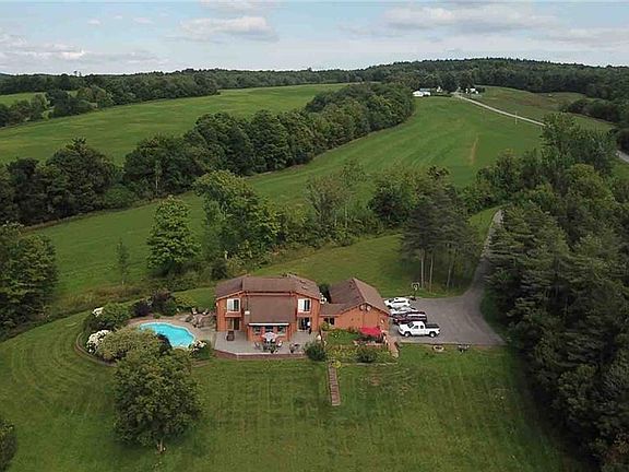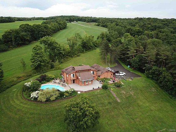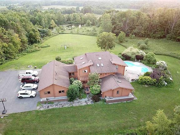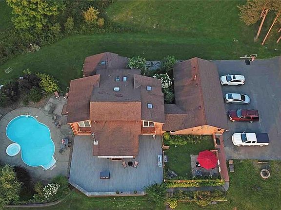 Spectacular home with phenomenal views of the Mohawk Valley and Utica all on 9 acres offering privacy and natural beauty. The property consists of two ponds, inground heated pool, large outdoor patio & garden area. The 4 bedroom, 3 1/2 bath home includes a spacious three stall cedar garage with full basement below and storage above. This home also features a gourmet kitchen with granite island and countertops, stainless steel appliances, custom cabinets, and Subzero fridge. Very bright open living area with high ceilings, skylights, wood stove, ceramic tile & cherry wood floors. Master bath includes jacuzzi tub, walk in stone shower with glass surround, bidet, & large walk in closet. Lower level includes rec room, photo studio, wine cellar, game room, family room, workout room, laundry area and access to outside. This home is built using double layer, high quality western red cedar post and beam materials surrounding 4 inches of solid insulation. This superior construction is designed to provide maximum insulation from the cold and the heat. This home features multi-zone hot water baseboard heat. Two bedrooms include sliding glass doors to outside balconies with views of the countryside. Large parking lot for guest parking and a special space for RV parking with 50 Amp hookup. Woods, fields and ponds offer a variety of outdoor experiences. Only 10 minutes from the city of Utica or Herkimer, but very private, secluded and serene. There are no comparable builds in the area.