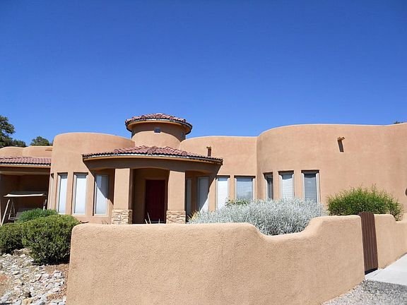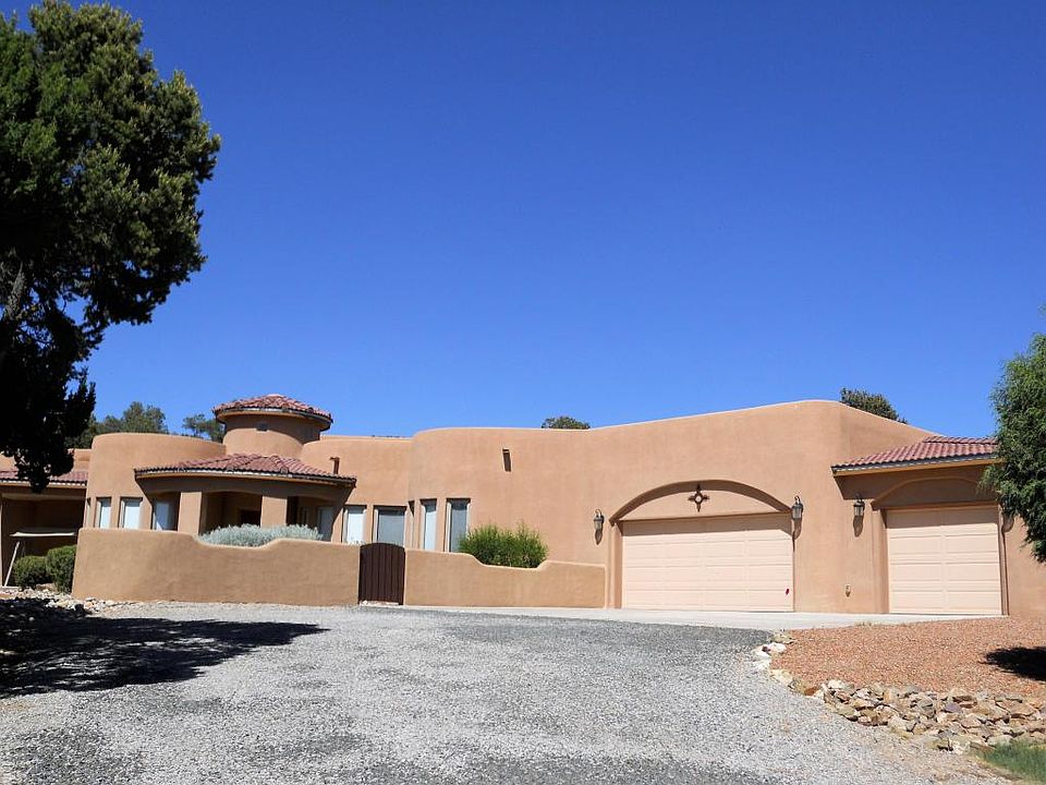 Graciously appointed SINGLE LEVEL home favorably nestled in the cool pines of the Rancho Verde Subdivision! Just 20 minutes to Albuquerque! Open, flowing floorplan perfect for entertaining! REFRIGERATED AIR! Expansive kitchen with giant pantry, island, granite slab counters and upgraded appliances. Cozy great room with high efficiency pellet stove. Dining space with views of 1.01 wooded acre lot! The SEPARATE Master Suite is ''sweet'' with dual vanities,oversized and jetted tub and separate shower. Generous walk in closet!Ceiling fans, nichos, recessed lighting, security system, R/O system and so much more! Massive 3 car garage! Easy care landscaping in front and back w/drip system. New pavers on rear patio! Fenced rear yard is perfect for pets! Come see why this one is a natural choice!