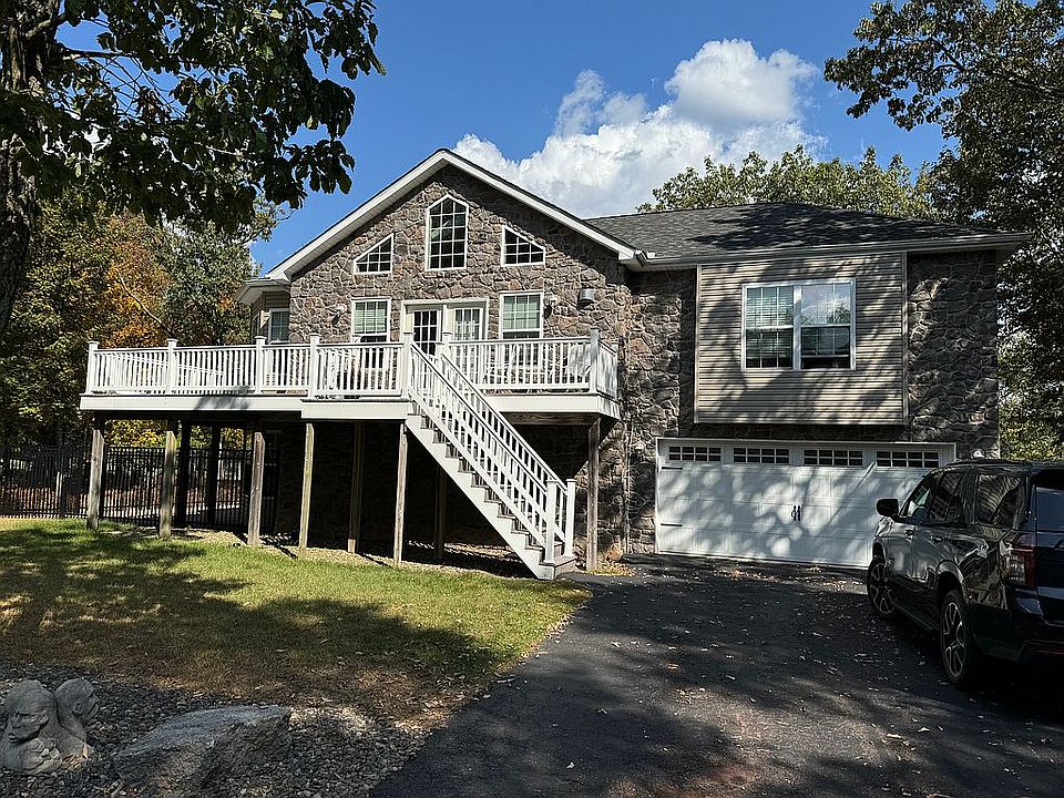 Located on the 4th hole of the 9 hole golf course in Beautiful Eagle Rock Resort. Gated community. HOA fee offers ski, 32 rounds of golf, indoor pool, 3 outdoor pools, lake, kayaking, hiking trails and a waterfall! Restaurant and SPA on premise. Gym, equestrian center and so much more. The home offers a primary bedroom and bathroom on the first floor. Walkout basement, with a gas fireplace, and bar! Main floor hosts a primary bedroom with bathroom, 2 other bedrooms on main floor. Another fireplace gives the open concept the perfect home feel! full house generator, wrap around porch to view the golf course., and an electric awning to protect you on those sunny PA days.