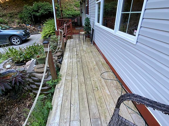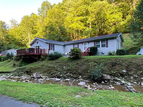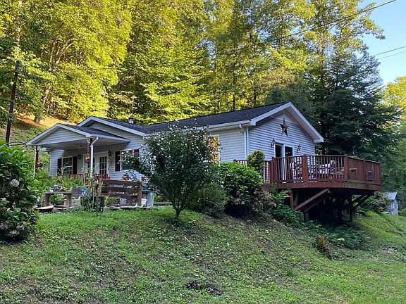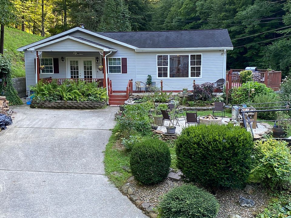 Enjoy the mountains of Kentucky with this 3 bedroom 2 bathroom home; fireplace in the living room and cathedral ceilings; formal dining room with wood stove to provide a back up warmth and a cozy atmosphere in addition to the heat pump; the kitchen has great space with range, refrigerator and dishwasher; there is a bonus room that could be a reading/computer room; the washer and dryer will stay in laundry room; there is a guest house above the detached garage with open floor plan, one bedroom and one bathroom, kitchenette with range and refrigerator; concrete driveway, city water, septic system, high speed internet; country setting; nicely landscaped; covered porch; nice deck over looking creek in front of home.