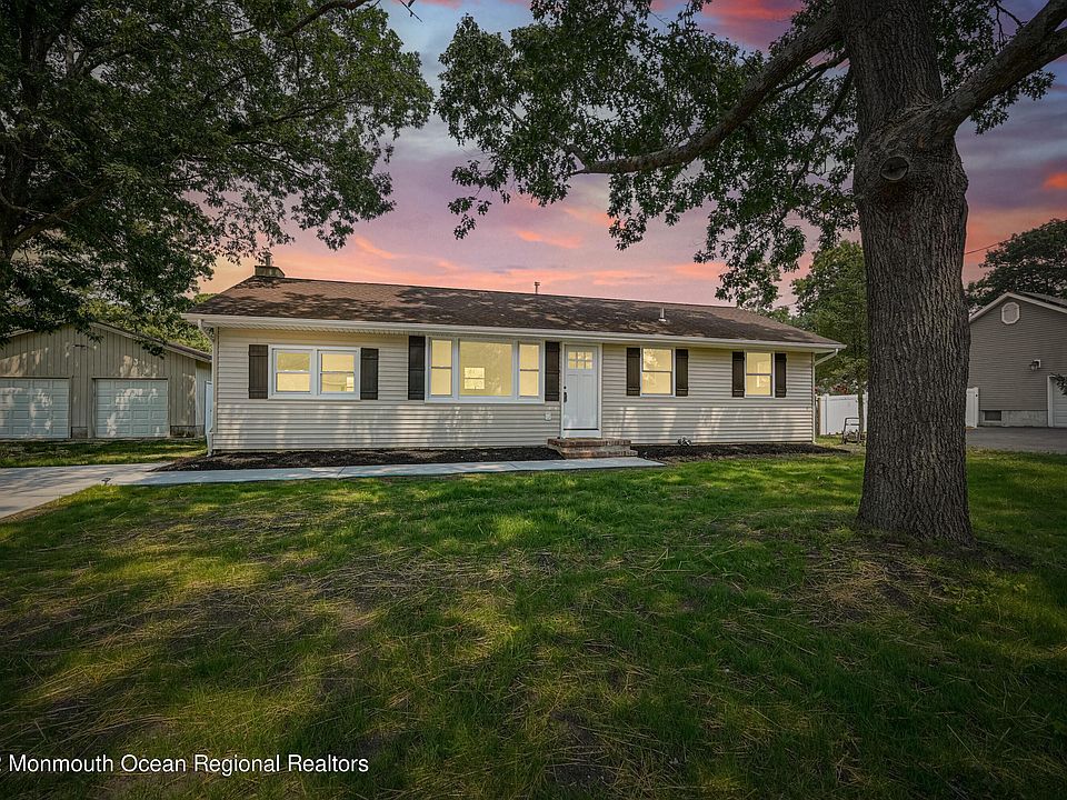Complete transformation with modern and stylish finishes throughout! This attractive ranch sits on an oversized lot with an oversized detached garage creating an expansive yard concept. Nothing to want for here with hardwood flooring, new roof, siding and systems. The house offers bright and open spaces, dedicated living room, new eat-in-kitchen with white cabinets, stainless appliances, stone counters, tile backsplash and a separate pantry. There is a large family room with plenty of space to also make a dining room or home office, 3 bedrooms, a trendy full bath, powder room and bonus laundry/mud room with a private entrance out to the side/back yard. The location is private and at the end of a neighborhood, only adding to the serene setting. Don't sleep on this one, check it out today!