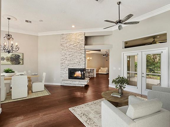 One or more photo(s) has been virtually staged. Nestled in the highly sought-after Cross Creek neighborhood of DeLand, this stunning three-bedroom, two-bath home has been beautifully reimagined for today’s modern lifestyle. From the moment you arrive, you’ll appreciate its prime cul-de-sac location, offering peace, privacy, and minimal through-traffic all set on a spacious one-third acre lot perfect for outdoor living. Step inside and fall in love with the warmth of rich wood flooring that flows seamlessly throughout the home. The open-concept kitchen is a true showstopper, featuring shaker-style cabinetry, open shelving, gleaming quartz countertops, and a stylish island with seating is perfect for morning coffee or casual dining. A tray ceiling adds architectural flair, while the electric cooktop and wall oven/microwave combo make both everyday meals and entertaining a joy. The split-bedroom floor plan provides comfort and privacy, with the primary suite tucked away on the western side and two additional bedrooms on the opposite end. At the heart of the home, a two-sided wood-burning fireplace, framed in beautiful stone, connects the dining area and kitchen, creating an inviting ambiance for gatherings or cozy nights in. Outside, enjoy the screened rear patio overlooking a lush, maturely landscaped backyard that is the perfect blank canvas for your dream outdoor retreat. The side-entry two-car garage and extended driveway provide plenty of parking for guests and family alike. Recent upgrades bring peace of mind with a NEW water heater (Sept 2025) and NEW HVAC system (Oct 2025). Sellers are offering a new roof prior to closing or a credit at closing allowing buyer to choose the color. All this, just a four minute drive to AdventHealth Hospital and an eight minute drive to historic downtown DeLand, where charming shops, restaurants, and the renowned Stetson University await.