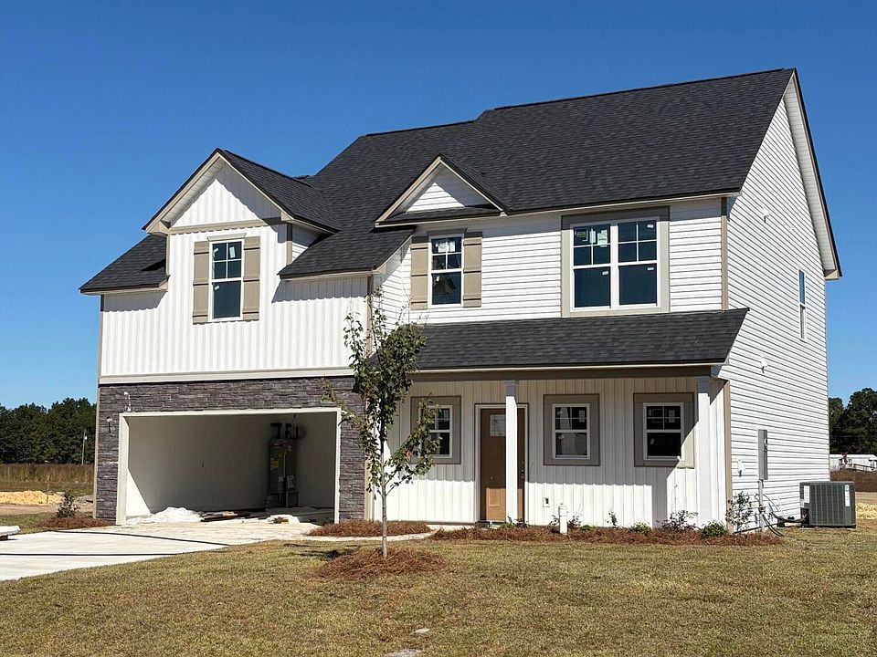 NO CITY TAXES! Golf club adjacent community with 1 year Builder offered golf, tennis & pool access. Classic white home with front porch & wood-look front door gives modern farmhouse vibes. Inside, enjoy LVP on the main level & baths, luxury kitchen with shaker cabinets, granite countertops, SS appliances, large pantry. Open concept floor plan with private 1st floor flex room for study, office, or playroom. Primary bedroom features TWO massive WICs, vaulted ceilings, en-suite with moody gray quartz countertops & double vanity. Two guest bedrooms share a ''buddy'' bath. Baywood Terrace is the perfect blend of quiet country living with easy highway access to Fort Bragg, shopping and dining. Highly rated schools & low monthly HOA that allows chickens! Late fall completion.