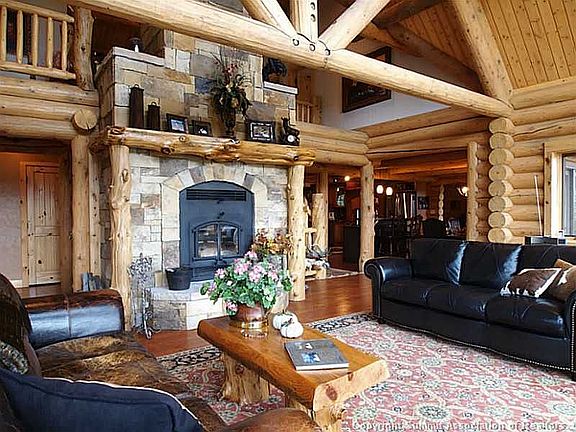 This spectacular custom log home is situated on 5 acres of total privacy and offers astounding mountain and valley views. Stunning architectural features and finishes throughout. The great room offers soaring ceilings, dramatic stone fireplace and a chef's kitchen. Deluxe master suite with spa style bath. Large family room, game room, gym, wine cellar and an amazing bar for entertaining.
