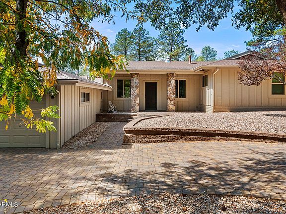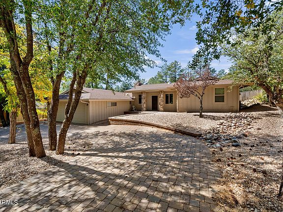 Nestled among the pine trees and just minutes from downtown Prescott in Hidden Valley Ranch. Improvements in the last 10 years include a newer roof, AC, windows (triple pane on east side and double pane on west), french doors, exterior paint, driveway and patio pavers, garage doors, and luxury vinyl flooring. The large kitchen and dining room features granite countertops, stainless steel appliances, pull-out shelves, an island, and recessed lighting. This single-story home has three unique levels: the main living space upon entry with patio access, four steps down to kitchen, bath, and laundry and three steps up to the bedrooms and bathrooms. Enjoy a paver patio in the naturally landscaped backyard. Community benefits include a pool, tennis and pickle ball courts, and clubhouse.