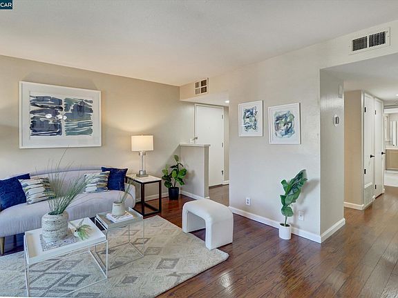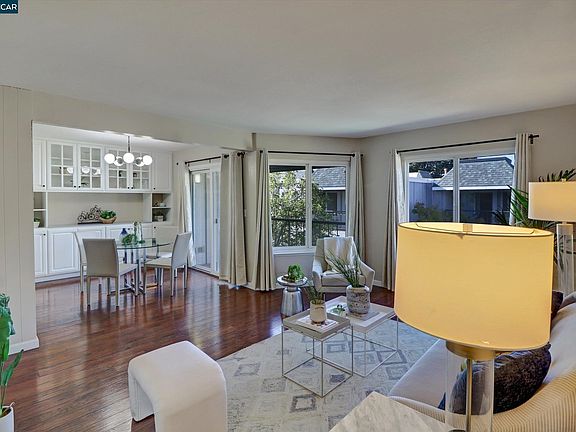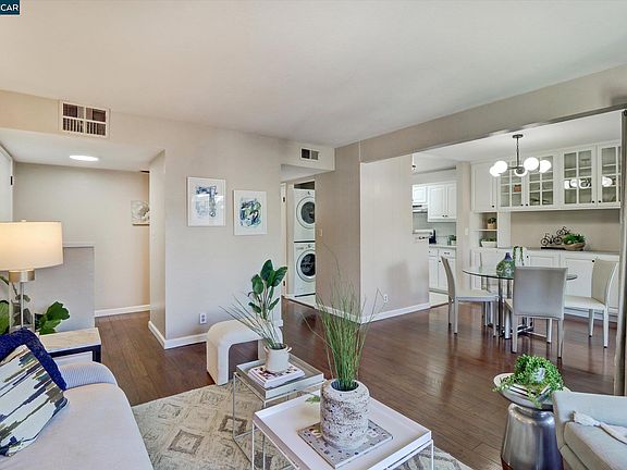 Wonderful opportunity to own this move-in ready 2-bed/1.5-bath condo in Walnut Creek! Conveniently located adjacent to Pleasant Hill BART, Sprouts Farmers Market, restaurants, shopping and freeway access – all within minutes. Flexible and open floor plan with spacious living room, bright kitchen, formal dining area with plenty of wall cabinet spaces, in-unit stackable washer/dryer, primary bedroom with large closet with closet organizers, 2nd bedroom optional den, office or guest room with walk-in closet. The upper floor unit is located adjacent to the community swimming pool and lush greenbelt so you can overlook the courtyard and landscaped grounds from the private balcony. Other amenities include remodeled bathrooms, newer flooring and interior paint throughout, newer F/A & A/C units, dual pane windows throughout, kitchen backsplash, new lighting fixtures, new free-standing range, new bar area cabinet and so much more. This hidden gem won’t last!!!