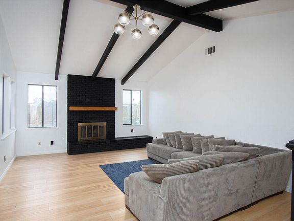 Recently painted black, the exposed wood beams and brick fireplace harmonize with the home's aesthetic. The guest bathroom has been completely remodeled and is sure to impress.
