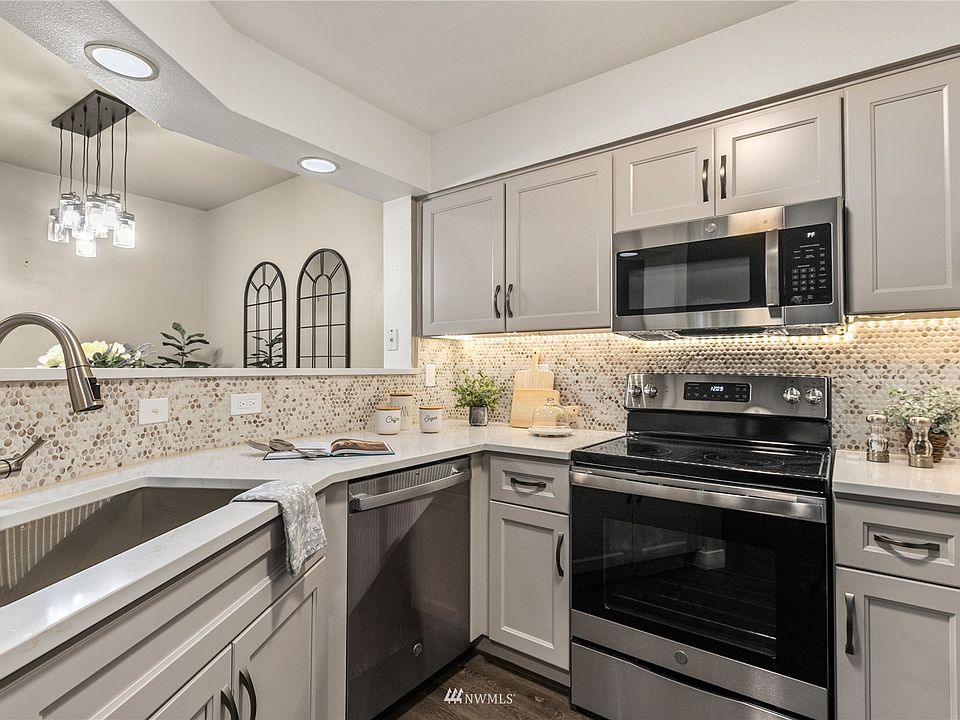 Fantastic updated ground floor unit in the Braewood Condo Community. 3 bedrooms, 1.75 baths with 1,199 livable sqft. Updated kitchen with new cabinets, quartz countertops, backsplash, undermount sink, all new SS appliances and new wet bar area. Large living room with cozy FP offers great access to the private outdoor patio surrounded by trees. Luxury vinyl plank flooring in the living areas, full dining room and tons of storage throughout. Laundry with full size W/D, 1 full garage and 1 additional dedicated parking spot with plenty of visitor parking available. Walking distance to the Park & Ride, and just 1 exit to UW Bothell. No rent cap!