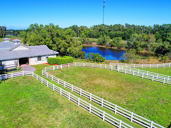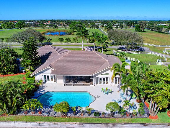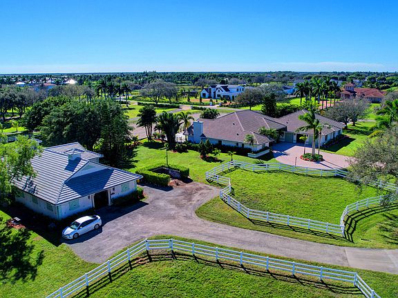 A five acre parcel, roughly 1.25 mile hack to the showgrounds. Located in gated Palm Beach Point, this property boasts a one-story house with 5 bedrooms, 5 full baths including a self contained efficiency apartment with separate entrance, driveway and parking. The screened patio overlooks the open pool deck and sand ring (approx. 92' x 220'). The 6-stall, center aisle barn has a separate driveway, 2 covered and 1 open wash racks, feed/tack room, owner's lounge and full groom's apartment with kitchen/living room, bedroom and bath. 6 paddocks. Pool resurfaced in 2019. New roof on house in 2016 new barn roof 2023. Pond will be filled in.