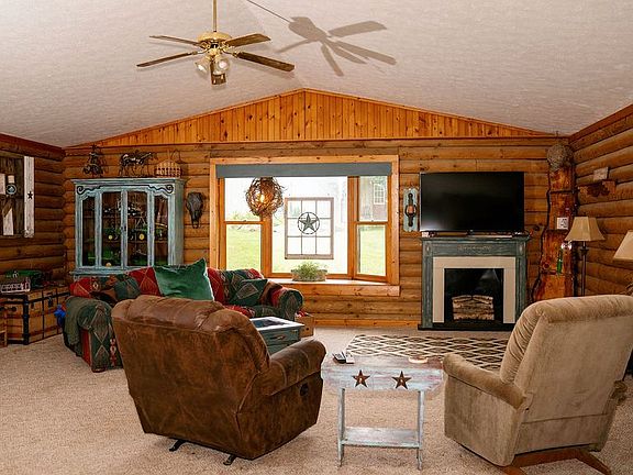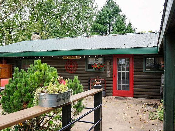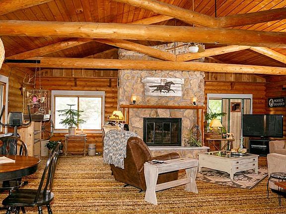 Hill top log ranch. Bring the animals. Beautiful heated show barn with 14 stalls and wash rack. Attached 60x120 indoor arena. Horse walker is included. House is set up to have full in law apartment with full bath and laundry. Main house has large open living room with fireplace, 2 bedrooms and bath. All appliances, 2 refrigerators, 2 stoves, microwave, washer and dryer. Must see for all the amenities. Several pastures and your own hay field.