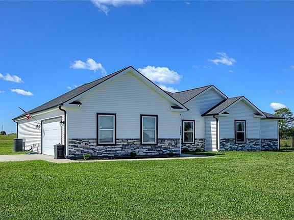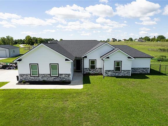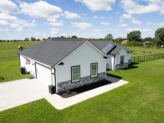 Stunning practically NEW home on 5 acres! Home boasts an open floor plan with excellent features like granite counter tops, farmhouse sink, a huge island, pantry & 10 Feet ceilings in main living area. This is not a standard builder grade home - interior paint is a luxury satin finish, kitchen hardware is upgraded, cabinets are custom, and LVP is throughout entire home - bedrooms included! Master bedroom walks out to the back porch with a gorgeous view. Master bedroom has 2 walk in closets for him & her! Master Bathroom shower is made from Onyx material which is specifically designed to be used in the bathroom. All bedrooms have walk in closets minus the guest room. 2nd Bathroom is has a double vanity and is accessible from the 3rd bedroom + hallway - perfect for kids or guests. High end water softener stays with the property, new in 2021! Sink filtration system added 2023. Top of the line appliances stay too! Sellers have added a HUGE 26x35x9 workshop/outbuilding - NEW April 2023! Shop is 150 MPH wind rated and can hold up to 60lbs of snow on roof. Large chicken coop stays for you. Owners have added a lovely large garden along with fruit trees - apple, peach, pear, plum, cherry, mulberry, elderberry, raspberry, blackberry and blueberry! Discover a magnolia tree and weeping willow on the property too. 250ft 6 foot tall fenced area off laundry room is a perfect run area for dogs or other pets. Fresh gravel has been poured before you meet the concrete driveway. Play set stays as an added bonus for any kiddos in your life! No restrictions - the land is truly yours to live how you always dreamed of.