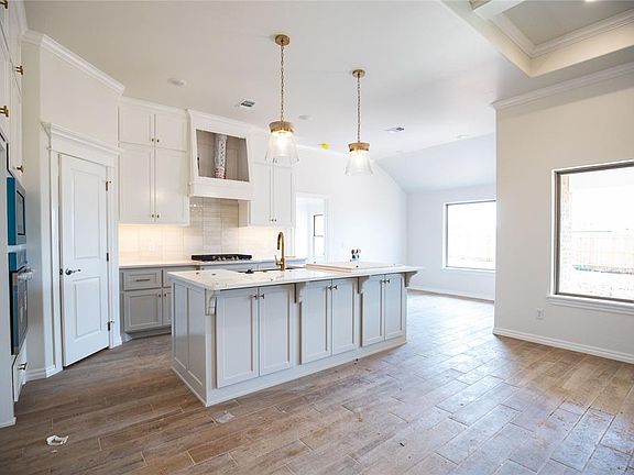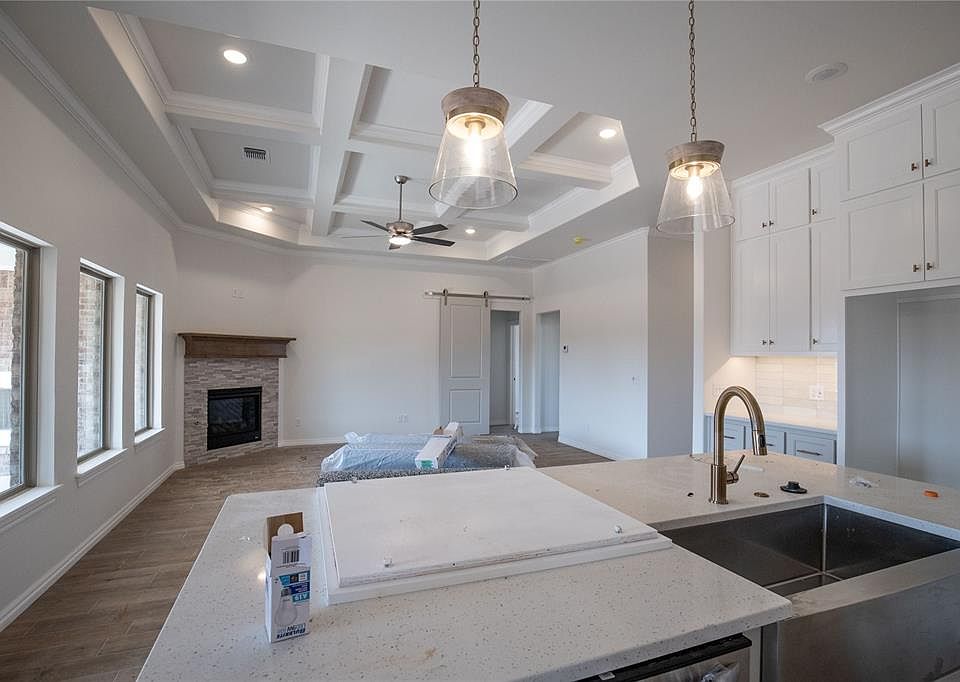 The Hazel floorplan has a total of 2,095 Sqft for living space, including 1,900 Sqft of indoor living & 220 Sqft of outdoor living that features a wood-burning fireplace, a gas line, & a TV hookup! This home offers 4 sizeable bedrooms, 2 full bathrooms, a utility room, covered patios, & a 3 car garage with a storm shelter installed! The great room presents a beautiful coffered ceiling with a ceiling fan, a gorgeous corner gas fireplace with our stacked stone detail, large windows, crown molding, wood-look tile, & a barndoor. The kitchen has stainless-steel appliances, decorative tile backsplash, a large corner pantry, 3 CM countertops, more wood look tile, stunning pendant lighting, & an oversized center island that holds a farm sink & a dishwasher. The primary suite spotlights a sloped ceiling detail with a ceiling fan, windows, & our cozy carpet finish. The prime bath has a Jetta Whirlpool tub, a dual sink vanity, a walk-in shower, & a huge walk-in closet. Other amenities for this energy efficient home include a tankless water heater, a whole home air filtration system, R-44 and R-15 insulation, & so much MORE!