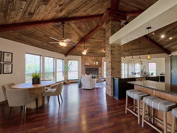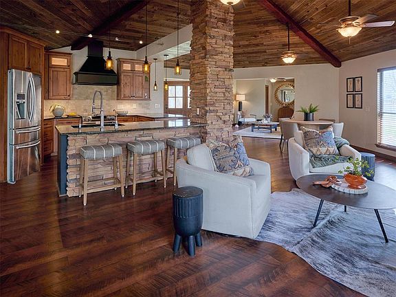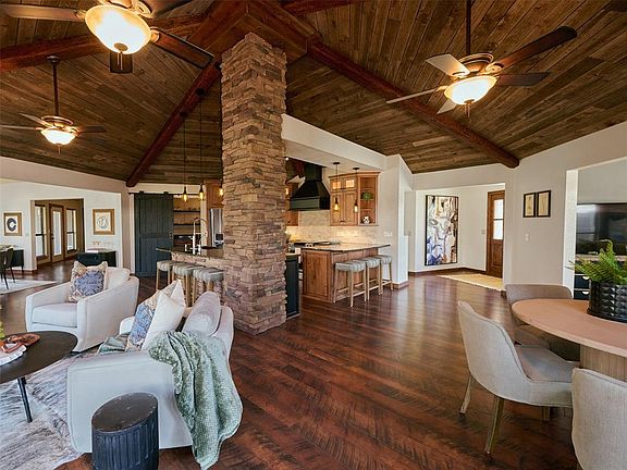Unwind as you take in breathtaking sunset views from your private dock, patio, or second-story deck. Inside, the home is just as impressive, with a striking circular reclaimed wood and beam ceiling serving as the heart of the living space.