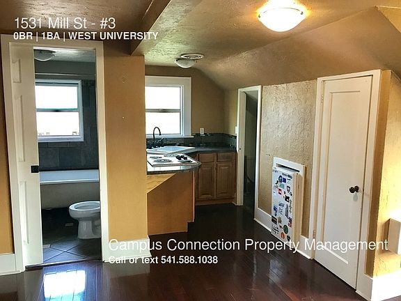 SCHEDULE A SHOWING ONLINE AT: showmojo.com/lh/bfce67a06e This West University upstairs triplex studio unit is in an ideal location at E. 15th and Mill - just a few short blocks to campus, two blocks to Hilyard Market, Max's, Dough Co, Subway, four blocks to Safeway and Starbucks, and a quick walk to many campus shops, restaurants, and nightlife! This studio features beautifully remodeled modern interior with hardwood and tile floors (no carpet). Cozy but functional layout with windows affording great views and natural light. Clawfoot tub shower and built-in bed for full size mattress (not provided). Small kitchenette with mini-fridge, full size range (no oven), and toaster oven provided. No off-street parking or on-site laundry but paid street parking is available through City of Eugene and laundromat is just a couple blocks away. Tenants pay all utilities and garbage. Some cats and small dogs (under 20 lbs.) OK that meet CCPM Pet Policy requirements. $750 refundable security deposit. $50 application screening fee per adult. Lease through August 12, 2018. Cats Allowed Small Dogs Allowed