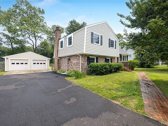 7.5 year old roof with 30 YEAR SHINGLES! 7.5 year old 2 ZONED HEAT PUMP HVAC SYSTEM! 4 BEDS, 2.5 BATHS! HUGE DECK with NEW TREX DECKING! LARGE DETACHED 2 CAR GARAGE! FRESHLY PAVED DRIVEWAY! BRICK PAVED SIDEWALK! Plantation Blinds throughout! BEAUTIFUL HARDWOOD FLOORS! NEW Stainless Steel Appliances! MAN CAVE/SHE SHED with SHIPLAP WALLS, DECORATIVE CEILING & CEILING FAN/LIGHT just off living room! Living Room with LARGE PICTURE WINDOW! Kitchen with DECORATIVE CERAMIC TILE Floors, TONS of CABINETS for STORAGE, and LOADS of COUNTERSPACE! Under CABINET LIGHTING! NEW TOILETS & VANITIES! Primary Bedroom with EN SUITE WALK-IN SHOWER! Large Family Room with BRICK HEARTH WOOD BURNING FIREPLACE! HUGE 4th Bedroom/REC ROOM! RECESSED LIGHTING in BASEMENT. 20 minutes from DOWNTOWN RICHMOND! 22 minutes from Short Pump! 40 minutes from FORT LEE!