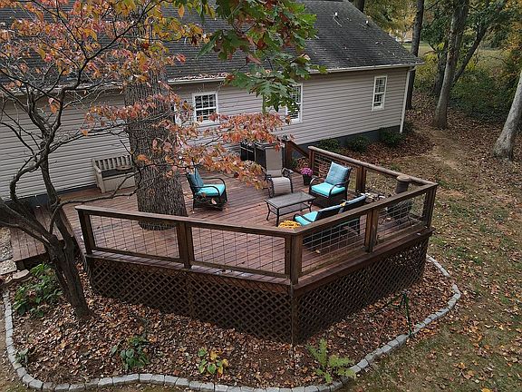 Enjoy a cozy backyard, with a deck, fire place, 4 burner natural gas Weber Summit Grill and the privacy provided by the trees and woods.