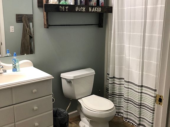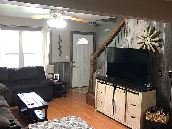 Private setting back to trees on large half acres lot, 1 1/2 story with Master Suite on main level, Main Level Laundry, Open concept, Great room, Kitchen and Dining areas are all open, Deck off Dining area, 2 large bedrooms upstairs, Full bath upstairs, Zoned Heating and cooling, Full basement with more potential, rough-in bath, and walkout. Nice front porch. 2 car garage. Remodeled kitchen with beautiful concrete counter top and sink. Refinished and antiqued cabinets. Appliances are black stainless that are 8 months old. It’s a must see farm house design