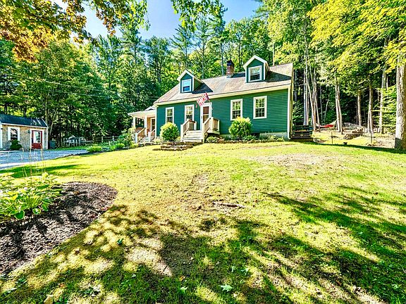 A STUNNING WEARE CAPE, WELCOME HOME! This beautifully maintained Cape-style home, offers 3BR's and 2BA's, with amazing curb appeal in the serene town of Weare. Step up the adorable covered porch and into an incredible sunroom with wood pine floors, vaulted ceilings, exposed beams, and skylights for maximum natural light. Ideal for the budding chef, the spacious kitchen is equipped with stainless steel appliances, tons of cabinet & counter space, and a massive granite countertop island, perfect for in-kitchen dining. Connected through gorgeous French doors is the sizable formal dining area with stunning built-in cabinetry and shelving, a perfect place for family dinners. The living area is a wow factor, with so much space, including an additional living area, ideal for an office, kid’s play area, etc., as well as more built-in shelving, hardwood floors and natural light galore. Upstairs you’ll find three spacious bedrooms and a full bathroom, with the primary bedroom connecting to the bathroom for en-suite convenience. The beautiful finished basement area provides additional living space ideal for a family room, home gym, or play area. Step outside to enjoy the large yard, perfect for outdoor entertaining, gardening, or relaxation. Set in a quiet location with serene sound of the Piscataguog River, this home offers the charm of country living with access to Concord and Manchester for commuting or shopping. DON'T MISS THIS GEM! Open Houses SAT 9/14 & SUN 9/15 from 11-1pm!