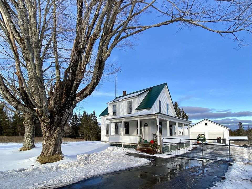 Enjoy peace and respite on this bucolic 45 acre farm. This classic beauty has much to offer. Timeless three bedroom home with many original details: hardwood flooring, unpainted trim and moulding in the foyer and parlours, and solid wood five panels doors throughout. Large wrap around covered porch overlooks the front yard. Attached two car garage with copious amounts of storage below. A thirteen stall barn located behind house in the back acreage. A large shed completes the outbuilding tally. Apple trees, wild blueberries galore. Property is only twenty minutes from ammenities in Calais and the International Border crossing into Canada; and a fifteen minute drive to the artist enclave of Eastport. Come put your stamp on this beauty!