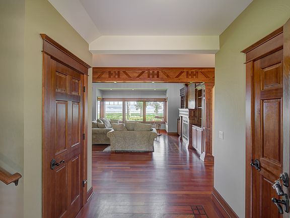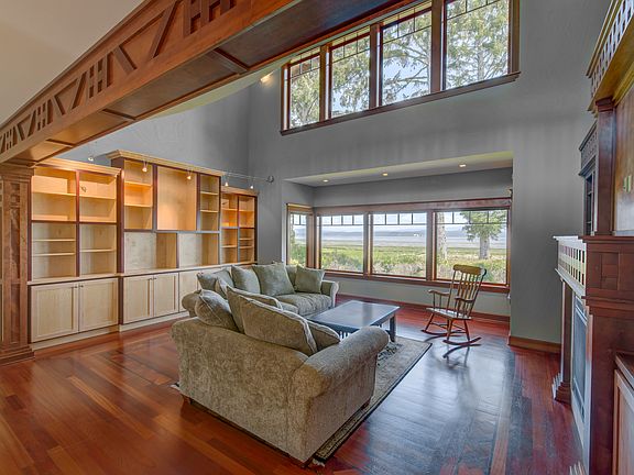 A museum quality masterpiece of the revered Craftsman architectural style, the floor plan inculcated with 21st century livability and finished inside and out with extremely precise woodworking craftsmanship, so cared for it looks brand new! In a private setting and on the pristine shores of Willapa Bay, located in an enclave , one of three custom homes that share a rustic NW forest road, leading you to your own specimen landscaped circular drive and home. There's inlaid wood floors, the burled finish wood tones built in, the massive beams with carved design throughout, those soapstone countertops! Huge unique artistic windows and glass lighting delight ! Extensive views, covered and open decks surround for entertaining and viewing wildlife!