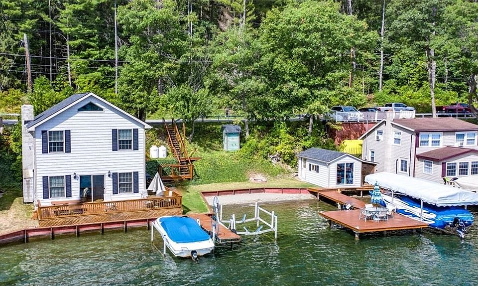 Spectacular 102 feet of waterfront on this new-build construction. 2-story home, sitting right at the water's edge of Keuka Lake! Sit on the large wrap-around deck and take in the panoramic views! 2 docks and a boat hoist, along with extra waterfront storage. Beautiful gradual pebble beachfront! Walk inside and you will find that this home is brand new! Plenty of working and storage space along with stainless appliances make this kitchen perfect for meal prep! Open living and dining room space with beautiful hardwood flooring, sliders to the deck and wood-burning fireplace. The large, full bath comes with plenty of storage. Upstairs, you will find three bedrooms including a master with vaulted, beamed ceilings and half bath. This is a great spot on the lake and offers beautiful sunrise views! Zillow shows high taxes! Taxes are actually $7700. See it today!