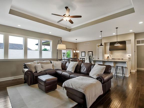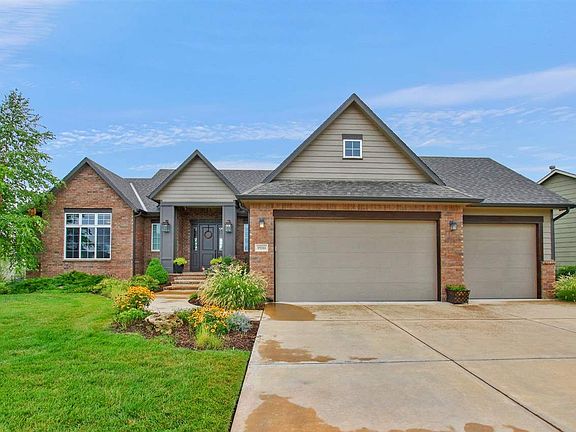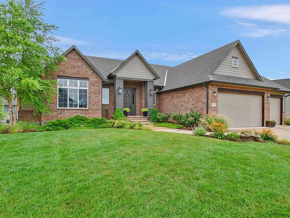 GORGEOUS; this one owner Nies built 5 BR, 3-1/2 BA split bedroom ranch shows like a model home! With beautiful curb appeal, this home is in the coveted Stonebridge neighborhood. The covered front entry way welcomes you in to the separate foyer that leads to the large open living space, beautiful with panoramic windows along the back wall flooding the space with natural light, hardwood flooring, white trim, floor-to-ceiling built in shelving/cabinets, and cozy gas fireplace. The gourmet kitchen is well equipped with granite counter tops, large center island/eating bar, stainless steel appliances, gas range, custom vent hood, white cabinetry, huge walk-in pantry, with adjacent dining room space for fun dinner parties that can continue outdoors on the covered back deck with the sliding door entry. The adjacent back hallway, featuring a built-in bench with hooks and cubbies drop zone leads to the garage door and separate laundry room. The lovely master en-suite invites you to relax with a large bedroom so light and bright with big picture windows, his and her walk-in closets, soaker tub, separate shower with beautiful tile detail, two sink vanities and private toilet. Two additional bedrooms connected by a jack and jill bathroom each with their own private sink and vanity and shared tub and toilet room and each bedroom has a walk-in closet. An additional powder half bathroom off the main living room for guests completes the main level. The mid-level walk-out basement showcases a large family/rec room with stand-up wet bar with soft close drawers. An additional two large bedrooms and a full bathroom complete the finished basement. Exterior features include professional landscaping, private covered deck, extended party patio, irrigation well and sprinkler system. This immaculate home has everything you are looking for in style and function. Andover school district with Sedgwick county taxes, this one is it!