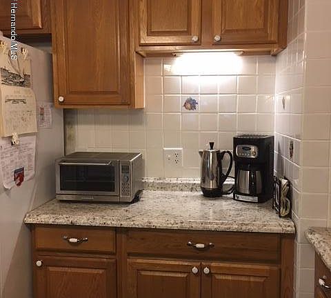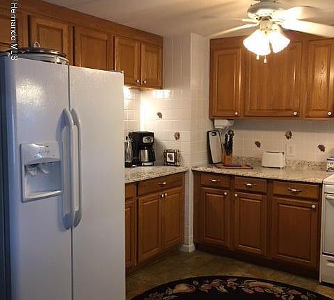 Move right into this immaculate 2/2 in Brookridge Community. Kitchen renovated with Oak Cabinets, new counters, new refrigerator and newer microwave and dishwasher. Flooring in Kitchen Armstrong Vinyl. Both baths completely renovated with walk in showers, no scold shower water system, & more. Enclosed Lanai w/plexi windows and separate a/c, heat & demudifier adding additional sq. ft. of living space. All windows are double pane and tilt out. Brand spanking new Trane a/c unit. Plenty of storage in baths & bedrooms. Indoor utility room w/ washer & dryer for extra convenience. Double wide driveway, great work shop w/ double doors for golf cart and screened in porch to enjoy the Florida Weather. Home situated on wide lot w/fenced rear & no-build behind. Too many features to mention.