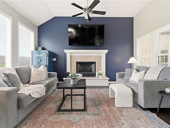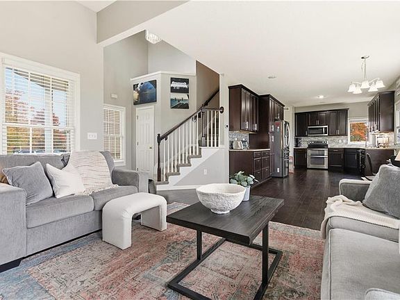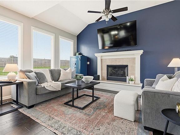 Home sweet home in Symphony at the Reserve neighborhood and award winning Blue Valley Schools with a 4th non conforming bedroom in the finished basement! This updated 2-story sits at the end of a quiet cul-de-sac, backing to green space for total privacy! Inside, soaring ceilings and hardwood floors create a bright, inviting feel. The kitchen shines with granite countertops, stainless steel appliances, tile backsplash, and ample storage. Upstairs, the large primary suite features vaulted ceilings, a spacious walk-in closet with built-ins, and ensuite with double vanity & vaulted ceilings. The lower level adds even more living space with a wet bar, egress window, and a 4th non-conforming bedroom. Bedroom-level laundry adds everyday convenience, and a brand-new HVAC gives peace of mind for years to come. Outside, you’ll love the in-ground sprinkler system, fully fenced backyard & durable Hardie Board siding. Don't miss the neighborhood pool—perfect for summer days! Amazing location with neighborhood trails leading to Heritage Park & Black Bob Park.