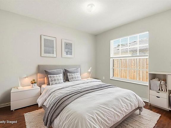 One or more photo(s) has been virtually staged. Inviting single-story home offering a spacious and functional layout with four bedrooms and two bathrooms. The welcoming entry features double front doors leading into a bright living area accented by a bay window. The kitchen is equipped with stainless steel appliances, a convenient pantry, and plenty of counter space. The primary suite includes a separate tub and shower for added comfort. Enjoy outdoor living on the screened-in porch overlooking the fenced backyard, perfect for relaxing or entertaining. A two-car garage completes this well-designed home.