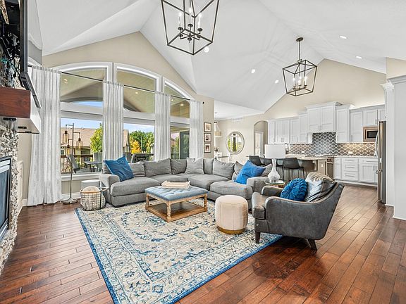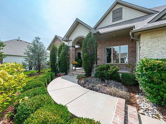 This beautiful 6 bedroom, 4.5 bath home in the esteemed Stonebridge neighborhood is the one! Beautiful curb appeal with extensive landscaping, side load garage and positioned perfectly on an almost half acre lot to enjoy the lake views, this one has it all. The oversized covered front porch is ideal for enjoying the beautiful hydrangea blooms that line the front sidewalk and leads to the stately 8ft solid wood door with privacy sidelites. Open to an expansive foyer with coffered ceiling detail and crown molding. The open living space boasts beautiful hardwood flooring, dramatic vaulted ceilings showcasing a floor-to-ceiling Nantucket stacked stone fireplace flanked by enameled built-in shelves and cabinets, floor-to-ceiling back wall of windows with custom electronic Lutron automatic shades, custom lined curtains, enameled 5" baseboards and crown molding, and designer Circa lantern lighting. The stunning kitchen has it all, complete with a large center island, beautiful granite countertops, WOLF gas range and oven, custom range vent hood, tons of enameled cabinetry with under and over cabinet lighting, soft close doors and drawers, granite sink with touch faucet and hidden walk-in pantry with working countertop and mini beverage fridge. Adjacent to the kitchen and open to the living room is a large breakfast nook space with a beautiful gold drum fixture and amazing water views through the three-glass panel sliding door leading to the fabulous covered deck. In addition, there is a formal dining room with boxed ceiling and double crown molding, glass chandelier and custom window treatments. Retreat to the primary en-suite to enjoy your own private entry to the deck, beautiful crown molding with recessed lighting, large chandelier, sitting space with large windows and custom Lutron shades and curtains, primary en-suite bathroom with two separate vanities, walk-in full tile shower with two shower heads, separate soaker tub, double chandeliers and a large walk-in closet with built in shelves and 3rd row seasonal racks. Connected to the primary closet is the laundry room with folding space, built-in desk and bench with cubbies and hooks. The laundry room is plumbed for a sink, if one was desired. Entry from the garage leads to a back hallway conveniently located adjacent to the laundry room with an additional drop zone with hooks and built-in cabinets. The split bedroom plan provides two additional spacious bedrooms on the opposite side of the house, both with large walk-in closets connected by a Jack and Jill bathroom providing each bedroom its own private vanity. The half bathroom is conveniently located adjacent to the open living space with a vessel sink, granite counter and designer mirror. Large baseboards, up-graded finishes including solid surface granite countertops everywhere, high-end fixtures and finishes set this home apart from the rest! The fully finished walk-out basement with its 9-foot ceilings doesn’t feel like a basement at all! It includes a second gas fireplace, open family room, large wet bar with up-graded stacked stone accent wall. A spacious bonus room, currently used as an exercise room, is another great addition to the basement and could be used as a theatre room or office. THREE additional oversized bedrooms all with large walk-in closets, and two connected by a Jack and Jill bathroom each with their own private vanities as well as another full bathroom complete the lower level. Ample storage in the basement along with a three-car side load garage can help anyone stay organized. Walk out (at grade) basement brings us to the brand new in-ground salt-water pool and spa just completed in 2024 this large outdoor living space is ideal for entertaining. Sprinkler system, irrigation well and fully fenced backyard lined with trees, fully stocked pond in your own backyard fun for fishing too! Sedgwick county taxes and Andover schools, this home truly has all that you’ve been looking for and more, don’t miss it!