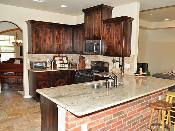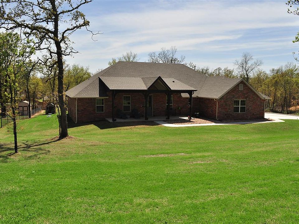 Gorgeous 4 bedroom home on almost an acre in Choctaw schools. Large open living area, knotty alder woodwork, granite countertops,large living room with rich hardwood flooring. Coffered ceiling and a corner fireplace!!!! 4 bedrooms,2 dining rooms and a storm shelter! Beautiful large lot that is fully fenced with a full sprinkler system and is located close to Tinker. Huge master with hardwood floors, coffered ceilings and great views in the sitting area. Private yard with storage shed and large balcony. Don't miss out on this 4 corners gem that has all the extras!!!
