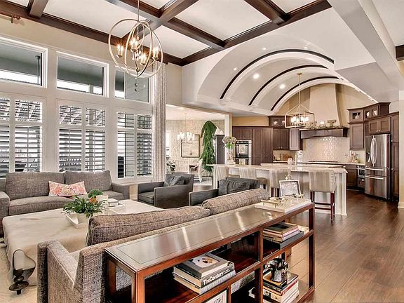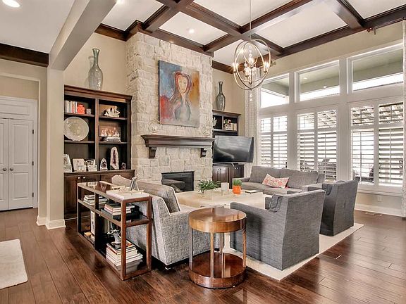 This exquisite Nies built 5BR, 4 ½ BA home in the esteemed Stonebridge neighborhood is a must see! Beautiful curb appeal, lush landscaping all the way around the house and positioned perfectly on an amazing lake lot, this one is sure to impress. The open floor plan boasts an expansive foyer, beautiful hardwood flooring, dramatic 12' ceilings showcasing a striking barrel ceiling with beams over the kitchen, crown molding, coffered beams over the living room, designer light fixtures, white trim, floor-to-ceiling windows with custom plantation shutters, a cozy stone covered gas fireplace with massive built-ins flanking each side. The gorgeous kitchen has it all, complete with both a working island and an oversized serving/eating island, beautiful granite countertops, double Bosch ovens, gas range, range hood, tons of cabinetry with under lighting, soft close drawers and hidden walk-in pantry. Adjacent to the kitchen and open to the living room is the dining space with a unique stoned accent wall, beautiful fixture and door leading to the fabulous covered deck that really makes this house extra special and one of a kind! The south facing deck had a $30K upgrade to double its size, add a complete rain proof pergola overhead, shades, electrical outlets as well as a ceiling fan. This improved outdoor living space is perfect to entertain and to enjoy your own beautiful lake views. Retreat to the master en suite with beautiful crown molding, stylish accent wall, master bathroom with large two sink vanity, walk-in tile shower with two shower heads, separate soaker tub, heated toilet seat and HUGE walk-in closet with built in dresser drawers. Connected to the master closet is the laundry room with its own wash sink and folding table. Entry from the garage leads to a back hallway conveniently located adjacent to the laundry room with a 4 hook/cubby drop zone and adjacent to a beautiful powder room with glass tile counter, bowl sink and designer mirror. The split bedroom plan provides two additional spacious bedrooms on the opposite side of the house, both with large walk-in closets connected by a Jack and Jill bathroom providing each bedroom its own private vanity. Large baseboards, granite countertops everywhere, high-end fixtures and finishes set this home apart from the rest! You just have to get in it to see the quality and feel the difference that these high-end finishes provide. The fully finished walk-out basement with its 9-foot ceilings doesn't feel like a basement at all! It includes a second gas fireplace, open family room, large wet bar with space for full size fridge, dishwasher or wine fridge and microwave. A spacious game room with French doors is another great addition to the basement. Two additional oversized bedrooms both with large walk-in closets, and one with its own bathroom as well as another full hall bathroom complete the lower level. Ample storage in the basement along with a three-car garage can help anyone stay organized. Sprinkler system, irrigation well and invisible fence are additional exterior amenities, not to mention the fully stocked pond in your own backyard fun for fishing and the perfect backyard space for a future pool! Sedgwick county taxes and Andover schools, this home truly has all that you've been looking for and more, don't miss it! Call today to schedule your private showing.