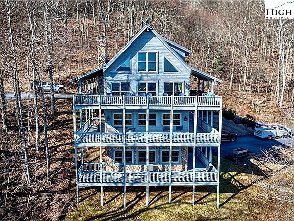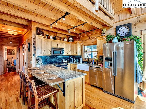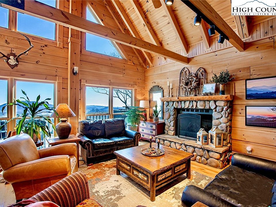 PRISTINE MOUNTAINTOP RETREAT sitting at 4,000’+ elevation on 2 AC with four levels of living space featuring stunning long range mountain views and end-of-road privacy in a beautifully landscaped setting with pond! Grand open floor plan with vaulted T&G ceilings, hardwood floors, stone fireplace , and an enormous wall of windows to enjoy the expansive, ever changing views. Kitchen designed with custom Alder cabinetry, farmhouse sink & accented with granite counters is great for entertaining. Main floor boasts bedroom with designer bath, a study or flex room, and the sprawling great room with fireplace for curling up on chilly nights. Top floor Primary Suite offers a lovely sanctuary with cozy view of the loft seating area. Lower level features family room, wet bar, 2nd Master Suite & laundry area. Finished basement provides elegant entertainment space and access to the 2 car garage. Outside, enjoy relaxing and taking in nature's glory while relishing the morning sunrise views on 3 levels of spacious decks, both open and covered. Log home infrastructure includes metal roof, stone accent walls, and lots of storage space - high quality custom features abound in this home. Just minutes to vibrant downtown West Jefferson's dining, galleries, breweries and entertainment as well as Mt. Jefferson State Park, New River access and all of you outdoor activities. This home exemplifies the best of quality, privacy and convenience - truly a mountain top gem!