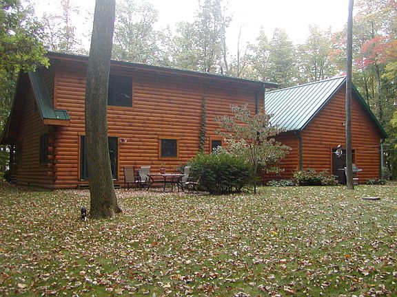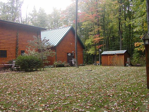 WOW!! talk about privacy and beauty!! One of a kind-- Custom built log home with solid pine doors - upstairs bath w/jacuzzi PLUS shower-front door has carved scene on it as does the fireplace mantle. Two car attached garage PLUS a 2.5 car detached done in the same log as the house. New standing seam roof. Take a walk back the wooded path to an open area that's great for garden, etc. or could be fenced for animals,(this is a fairly large area). This is all very secluded and surrounded by woods!! If you like country privacy-you won't be dissapointed in this one.