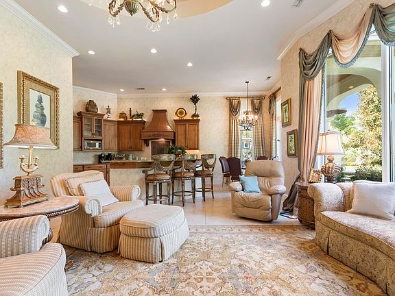 Beautiful 3 bedroom, 2.5 bath former model home with steel frame construction is a "Must See!" This former model home is loaded with features including wall niches with stone ledges, custom window treatment and rods, tile flooring throughout the main living areas and carpeted bedrooms. The living room is complete with a large bank of windows that over look the outdoor living space, a stunning circular tray ceiling with medallion and a impressive stone fireplace with niche. The kitchen features warm maple cabinets with rope detailing and occasional glass inserts, custom vent hood, stainless steel appliances, tile backsplash with feature tile inlay, granite countertops, breakfast ledge with additional barstool seating and a breakfast nook. Off the kitchen is the formal dining room adorned with columns, floor to ceiling windows and a tray ceiling and chandelier. In addition to the main living room you'll find a great room perfect for watching a movie or enjoying a good book. Entering the homes large owner's suite you'll find another exquisite tray ceiling with up lighting and medallion, floor to ceiling windows and a large sliding door with private access to the outdoor living space. The spacious owner's bath features dual sinks, make-up vanity, walk-in tile shower, jetted soaking tub, custom wall coverings, window treatments and an enormous walk-in closet. There are two guest bedrooms; one with private access to the outdoor living space. Enjoy your summer outdoors in this tranquil backyard setting complete with "one of a kind" pool and hot-tub accented by tile and stacked rock. Expansive hard scape offers multiple areas to sit and enjoy nature and the covered lanai is perfect for entertaining. Don't miss your opportunity to live in Grande style!