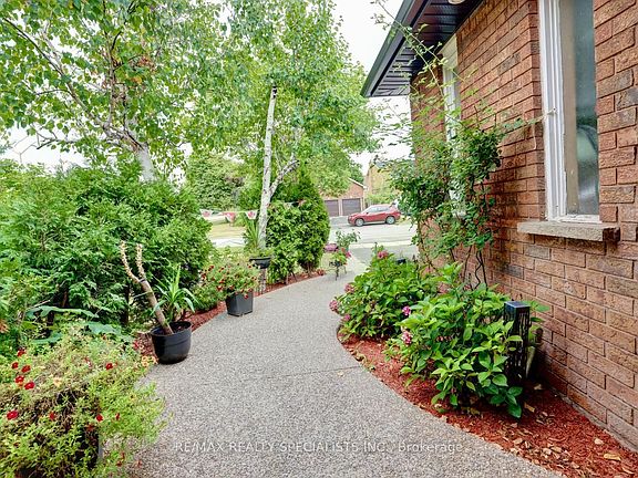 Triple exposed aggregate drivewayPrivate covered porchPerennial gardensSpacious foyerSoaring ceilingFormal roomsBay window