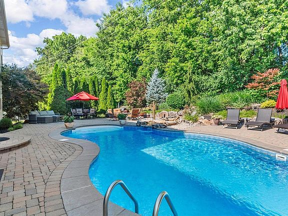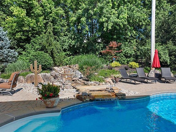 RESORT STYLE LIVING!!! This charming 2-story in Heritage Landing offers YOUR OWN private backyard oasis complete w/ a breathtaking saltwater pool (w/heater and cooler), tranquil waterfall, professional landscaping & mature trees. Step into the 2-story foyer, spacious dining room, home office, and family room w/gas fireplace. Chef's kitchen features granite counters, professional KitchenAid SS appliances, 6 burner gas range, Bosch dishwasher, wine bar, built-in ice maker, center island, walk-in pantry, & breakfast room. 2nd floor offers a large master bedroom suite, updated spa-like bathroom and walk-in closet. 3 additional bedrooms and an updated full bath! Finished LL features a cozy theater room for movie nights, bonus rec/sleeping room, a full bath, and plenty of additional storage room. New Roof (2023), HVAC (2022). New windows (2021). Updated stonework on front of home. Plantation shutters. Irrigation system. Conveniently located close to HWY 364. A Rated Francis Howell schools.