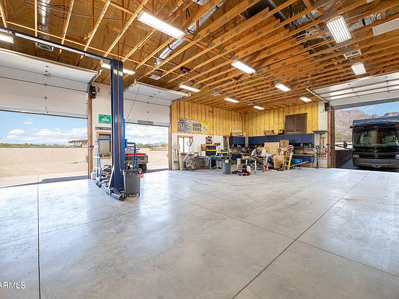 construction multi-car garage, with incredible Superstition Mountain views. This RARE gem is a dream for all car buffs, entertainers, and more! Bring all your toys -there's room as it is designed to also store a 42' MotorCoach. Fully insulated and air-conditioned with RV doors, air compressor lines, car lift, bathroom, ample storage. Ideal for all your projects and toys. You can't build this for the price!