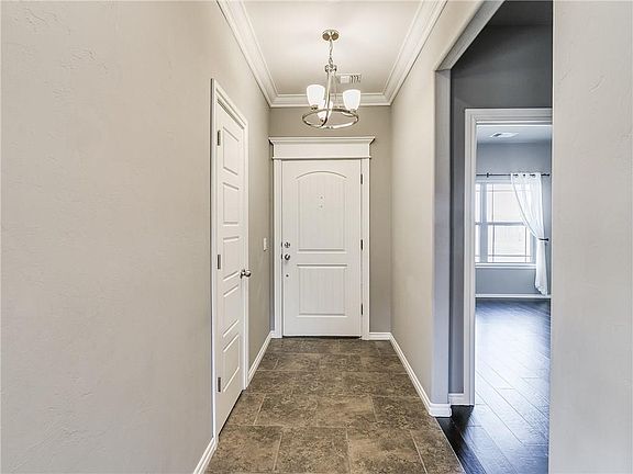 With pond view from the front porch this beautiful quality built home is located just minutes from I-240, I-44, I-35, restaurants and shops. From the entrance you are met with all updated features and plenty of natural sunlight from the over-sized windows. The light fixtures are extraordinary. split floor-plan. Bright colors in the home come together and creates a clean and modern atmosphere. The wood floor in the living area is a great contrast to surroundings. Center of the living area wall is a cozy fireplace. The open concept allows for a dream kitchen with 3CM granite throughout, vented microwave, under cabinet lights, dual oven with 5 burner gas stove, corner pantry, and much cabinet space. Around the 9ft. ceiling is 6 inch crown molding. From the master bed you are welcomed into a amazing master-bath with walk-in shower and walk-in closet. The home entails smart touch screen thermostat. The garage has an in-ground storm shelter. Covered patio, stained fence with steel post.