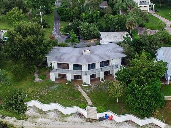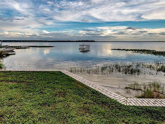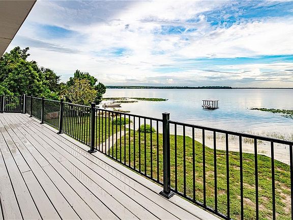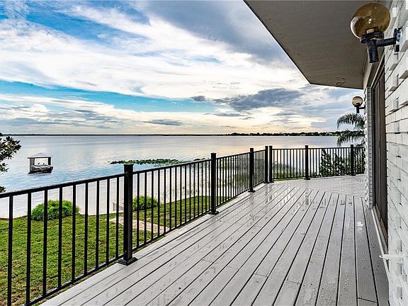 PANORAMIC LAKE VIEWS FROM TWO LEVELS! WALK-THROUGH VIRTUAL TOUR AVAILABLE! This mid-century modern, sprawling home boasts some of the best views on the lake! Once you enter into the front doors you will be captivated by the light and bright living space with two sets of sliding glass doors leading you onto the large second story deck. The kitchen radiates charm of it's mid-century modern design, including a built-in, vintage oven, ample cabinet space, cooking island and sprawling granite counters. Attached to the kitchen is a large laundry room with a sink and extra refrigerator. The master bedroom features sliding glass doors with lake views, built-in dresser, en-suite bathroom with dual sinks, soaking tub, and separate shower. The additional guest rooms on entry-level are over-sized rooms with a full wall of built-in cabinetry and floor to ceiling natural light - adding to its unique mid-century design. Downstairs you will find a large bonus room complete with wet bar and fireplace - perfect for coming in straight off the lake for lunch or snacks! There's also an additional bedroom, bathroom and half bath downstairs as well. The real gem here is approximately 115' of lakefront white sandy beach. Additional features include a dock with covered boat lift, concrete sea wall and 3 car garage.