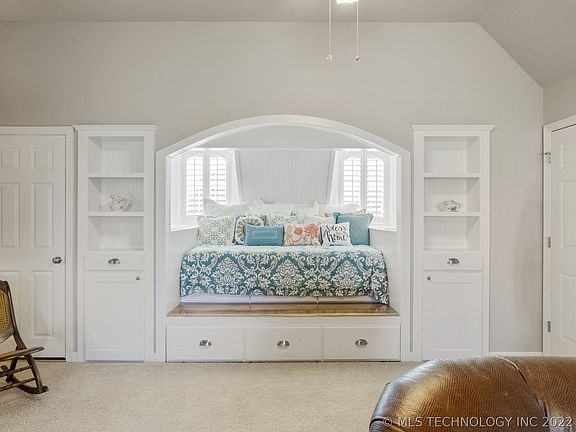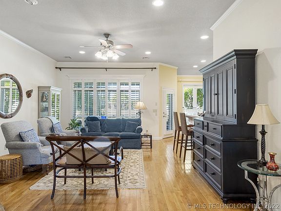 ON THE GOLF COURSE! SELLER OFFERING THEIR BUYER $7,500 TOWARD CLOSING COSTS OR BUYING INTEREST RATE DOWN! A relaxing Nantucket style interior finely appointed w/special touches throughout and sequestered from the street for peace & privacy. Full brick exterior, 2 bedrooms and office on first floor, updated windows w/golf course views, abundant customized storage spaces throughout, 2nd living w/ included entertainment center segue as 4th bed quarters. Pantry and double ovens. "Family Safe" storm shelter included in sale. A magnificent weeping willow shades back lawn. A well kept happy home w/happy colors in super clean condition. Mostly full brick home neighborhood promotes lasting beauty! CLOSE to Tulsa near 51st BA expressway entrance.