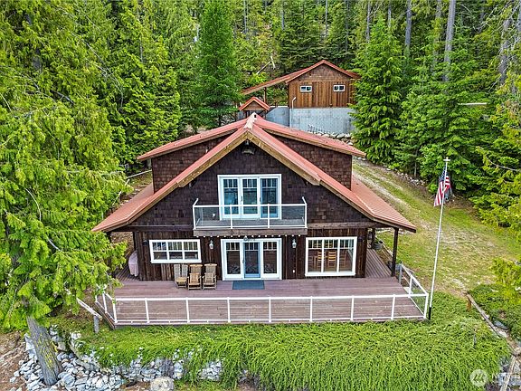 Discover your dream getaway on the shores of Lake Wenatchee. Enjoy as a full time residence or a vacation escape. This beautifully maintained turn-key home offers comfort and year around recreation. Main floor features an open layout with a bright kitchen—white cabinets, quartz counters, and subway tile. The living room showcases hardwood floors, river rock gas fireplace, and floor-to-ceiling windows. A serene primary suite offers a walk-in shower, clawfoot tub, and generous closet space. Upstairs, you'll find a spacious bedroom with attached 1/2 bath, a second elegant primary suite, and a flex room for media or 4th bedroom. Enjoy lake views from the large deck, shared dock, beach area, heated walkways, ample parking & heated 2 car garage.