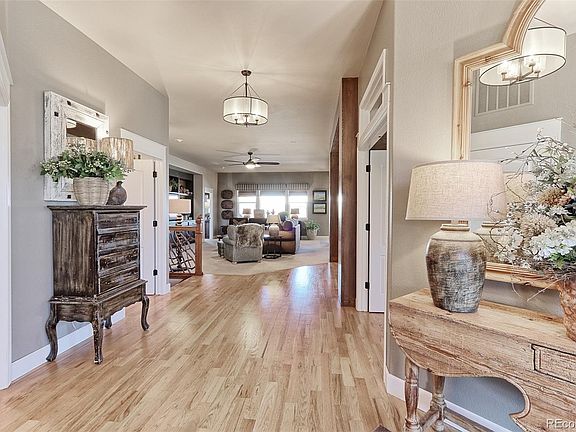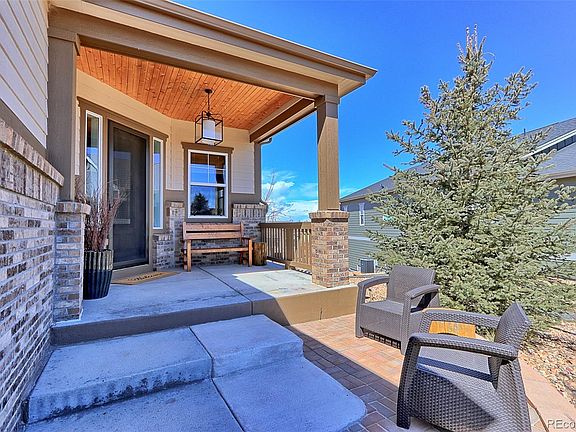Welcome to this Magazine quality home in the beautiful Heritage Todd Creek active adult golf community, where the question isn't "What is there to do tonight" it's "What of the many things going on in our community should we do tonight". From the moment you enter this home you are greeted with custom designs and accents around every corner. From the hardwood entryway you feel the open floorplan with 10 foot ceiling on the main level. To the left is a private main level 2nd bedroom, with attached full bathroom and wood beam ceilings. Next is the garage entry and mudroom where the washer/dryer have been moved to the master closet (where they should be right!) making room for an addition refrigerator, under cabinet wine cooler, wine racks and utility sink. To the right is a cozy Den/office with fireplace and custom cabinets. Next is an impressive wood wrapped passthrough that enters the dinning room with designer lighting and more wood beam ceiling. The family room has been redesigned to have a large feel with custom cabinets and shelving, plus a fireplace. In the redesigned kitchen note the quartz counter tops, large crown molding detail, tray ceiling, double ovens, dishwasher, refrigerator, Thermador gas cooktop, Half-barrel style hood, all in stainless steel and all included with the home, eating area with added cabinets, door to a covered deck with built in Lynx BBQ, and great golf course and mountain views. Between the kitchen and dinning room is a butlers panty with built-in keg fridge and tap plus a large walk-in panty. The main floor primary bedroom has more wood beam ceilings, great mountain view, on-suite 5 piece bathroom and large walk-in closet with washer/dryer. The full walk-out basement is mostly finished, done in the same great quality finishes adding an additional bedroom, 3/4 bathroom w/ steam shower, craft or flex room, and several game or sitting area's plus there is still room for a large storage area with included shelving.