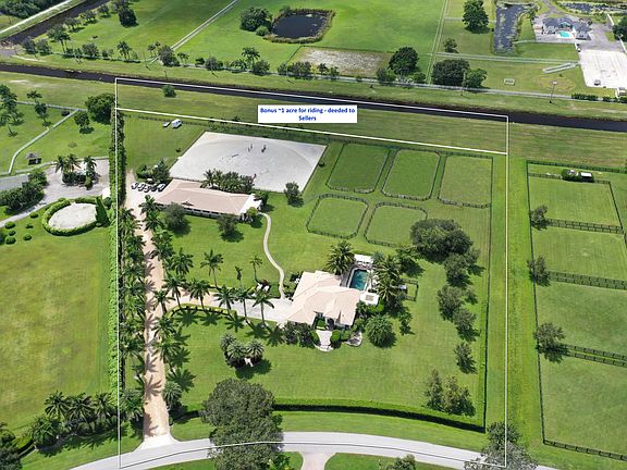 Rare opportunity to own this 5.66 acre equestrian estate in Palm Beach Point, with ability to ride on an additional ~1 acre along the canal. Property has a 4 bedroom/3 bathroom pool home with 2 master suites and a 12 stall center-aisle barn, both with generators. The pool home has a new pool heater and chiller, 3-car finished garage, separate office, and new Viking appliances in the kitchen. The property has a great site plan, with the home towards the front and the equestrian features all located in the back, with ~140' x 200' GGT footing arena. The barn has AC'd feed room, tack room and a one bedroom staff apartment, plus 3 wash/grooming stalls, laundry room, half bath and separate shaded viewing area. Additional parking behind the barn for trucks and trailers.